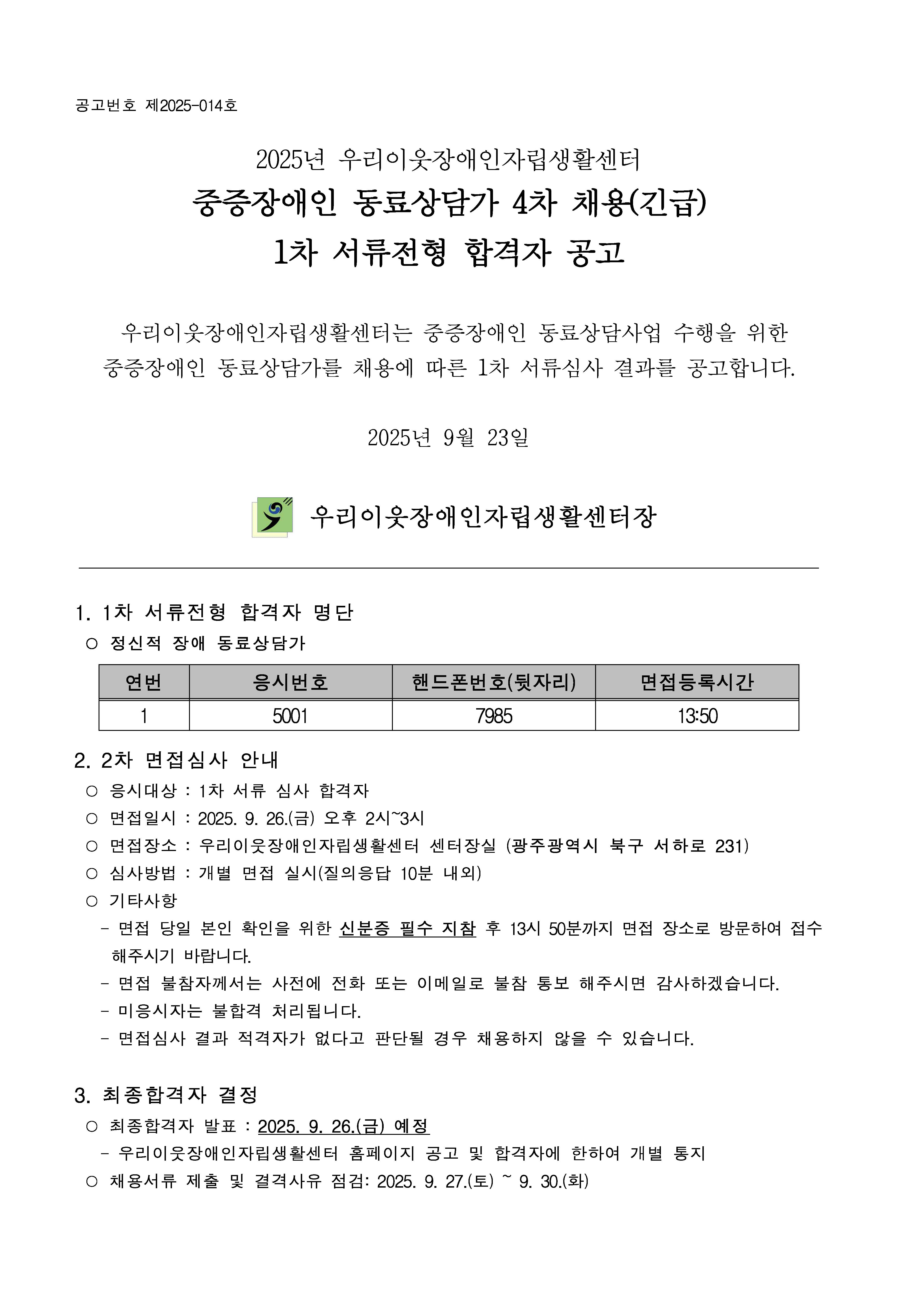 [채용]중증장애인 동료상담가 4차 채용(긴급) 서류전형 합격자 공고 2025-09-23 첨부파일 2025 중증장애인동료상담가 채용 재공고 1차 서류합격자 공고.pdf 관리자우리이웃 장애인자립생활센터 목록