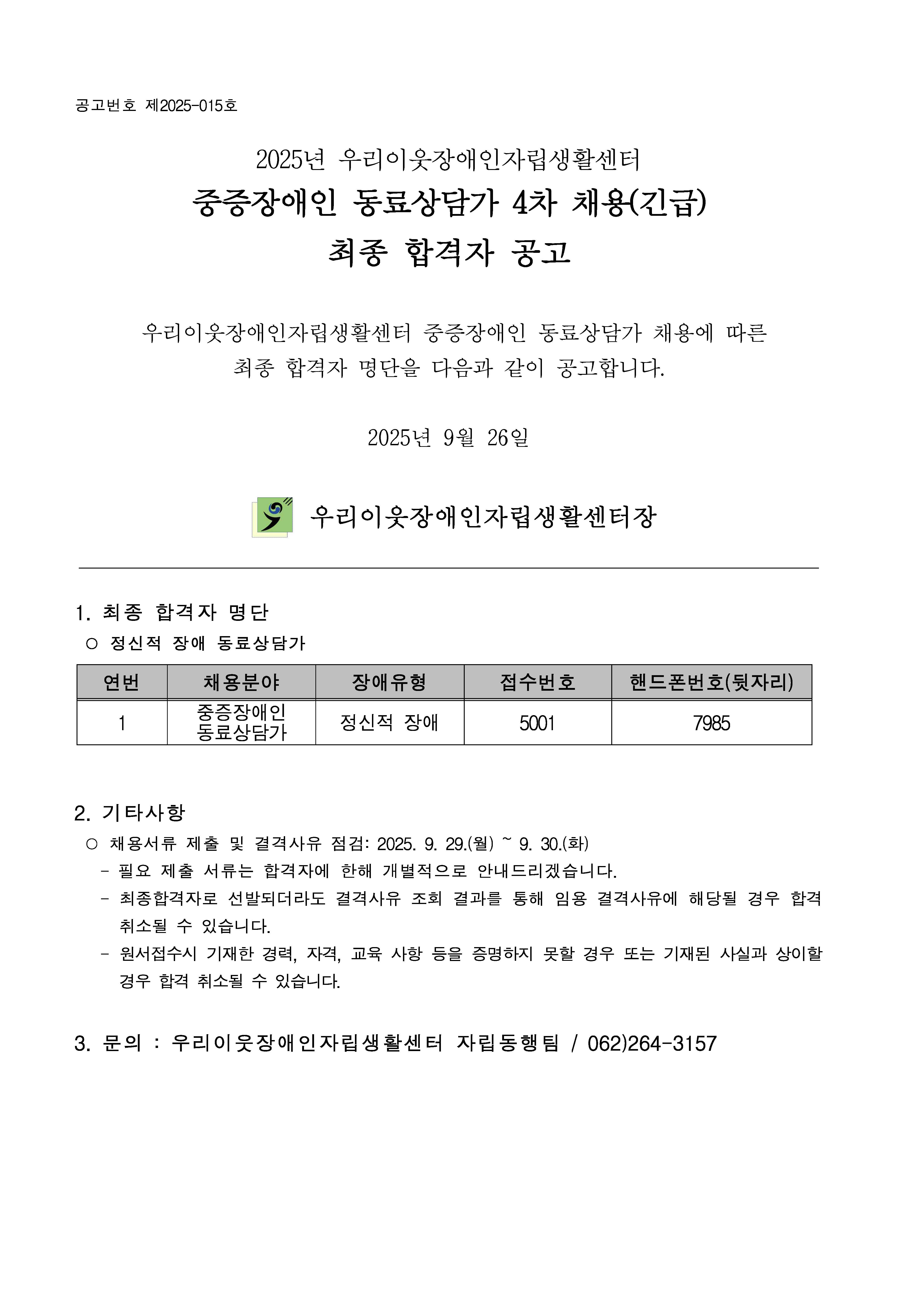 [채용]중증장애인 동료상담가 4차 채용(긴급) 최종합격자공고