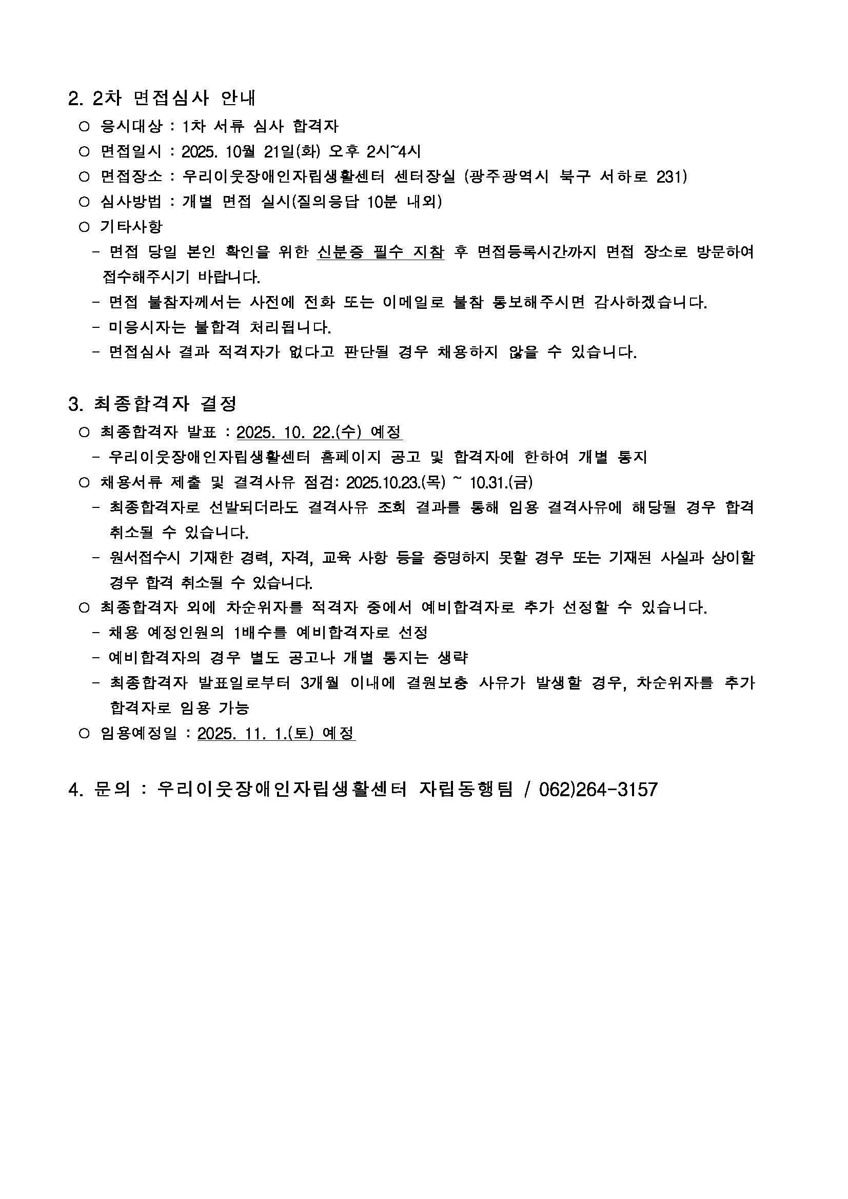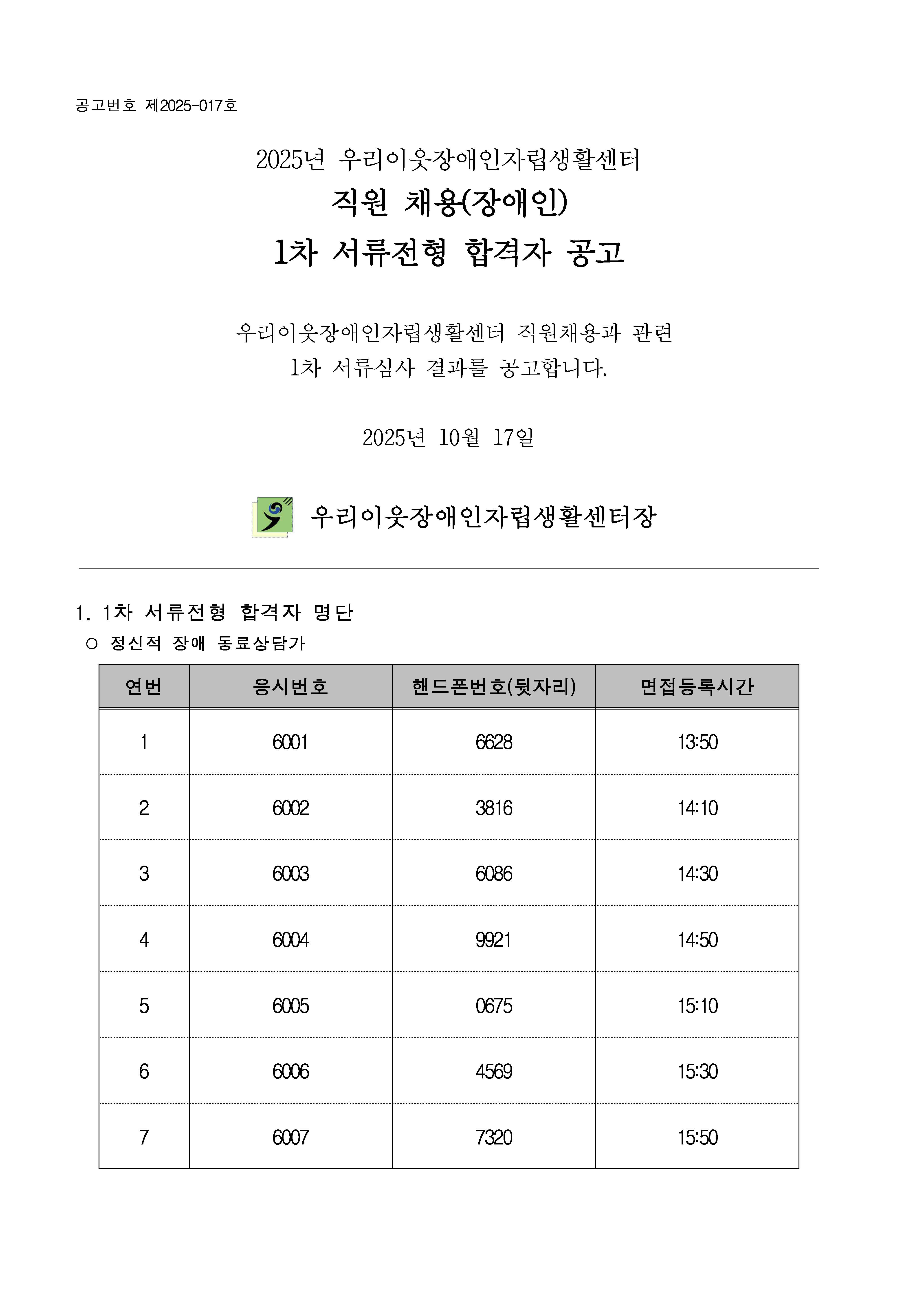 [채용] 우리이웃장애인자립생활센터 직원 채용 1차 합격자 공고 2025-10-17 첨부파일 2025 장애인자립생활센터 직원 채용(장애인 채용) 1차 서류합격자 공고.pdf 관리자우리이웃 장애인자립생활센터 목록